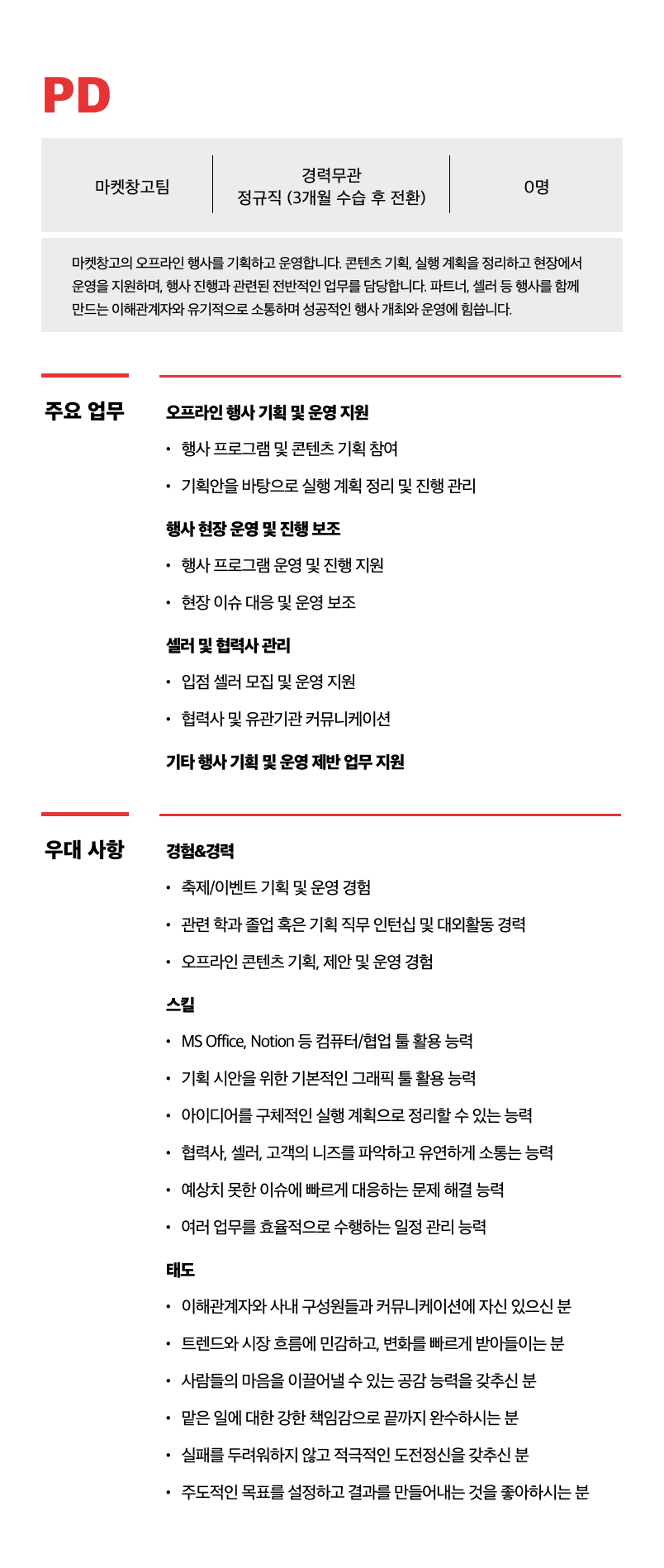 채용공고공간과 콘텐츠를 연결해 특별한 일상을 선물하는 마켓창고에서 모두의 기억에 남는 경험을 기획할 PD를 찾습니다